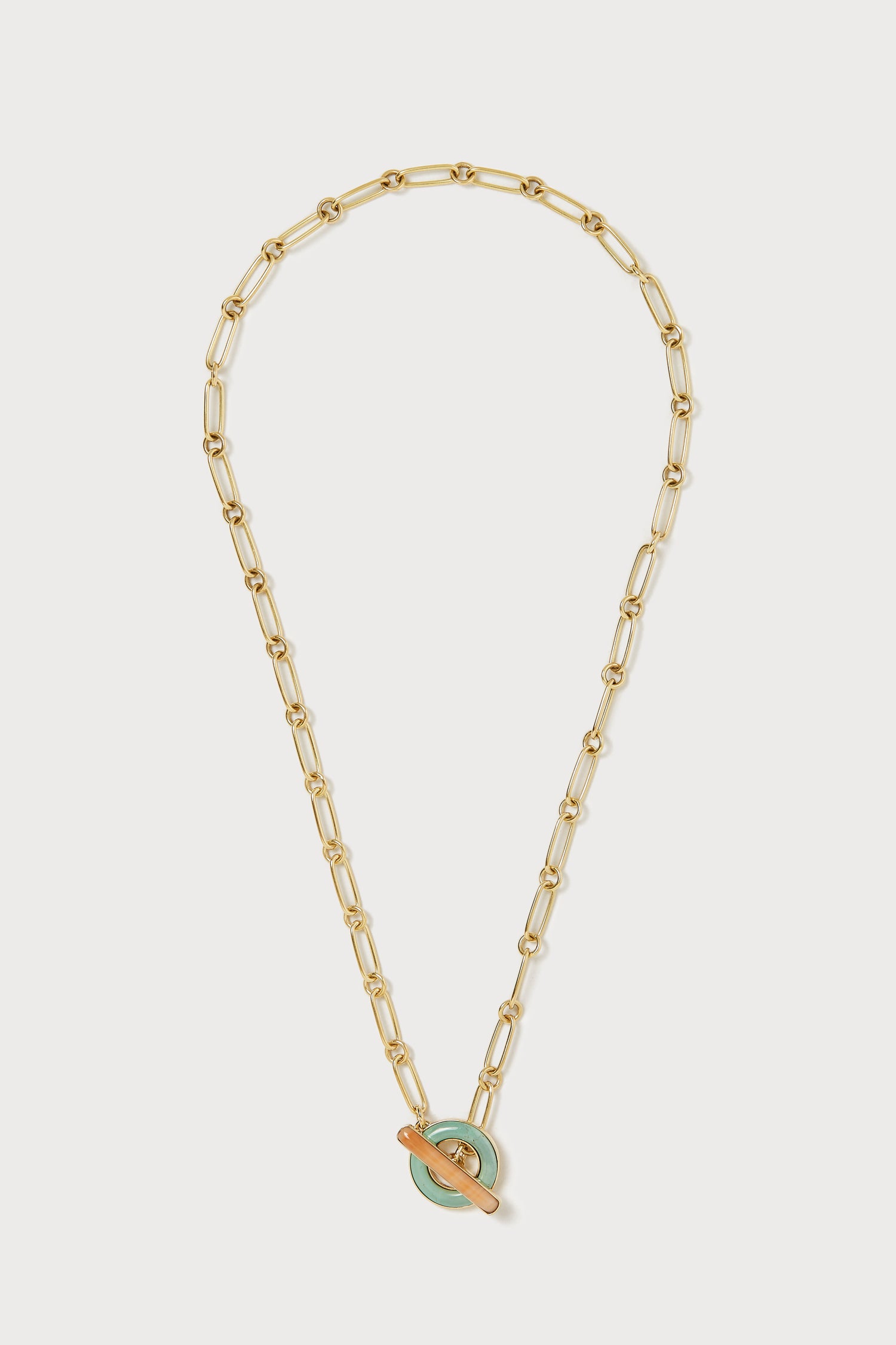 A hand carved toggle necklace with two complimenting colored stones, framed in 18 karat gold on an alternating round and oval link handmade chain.