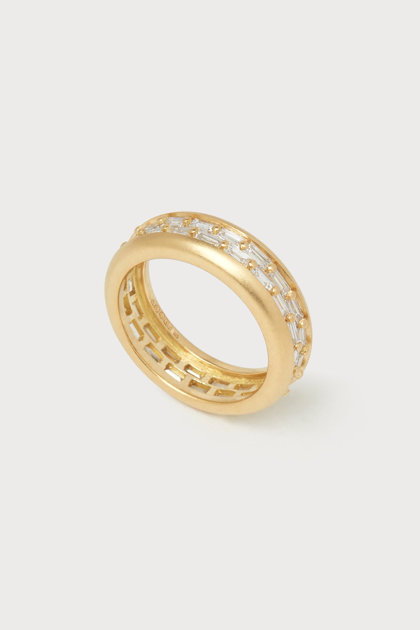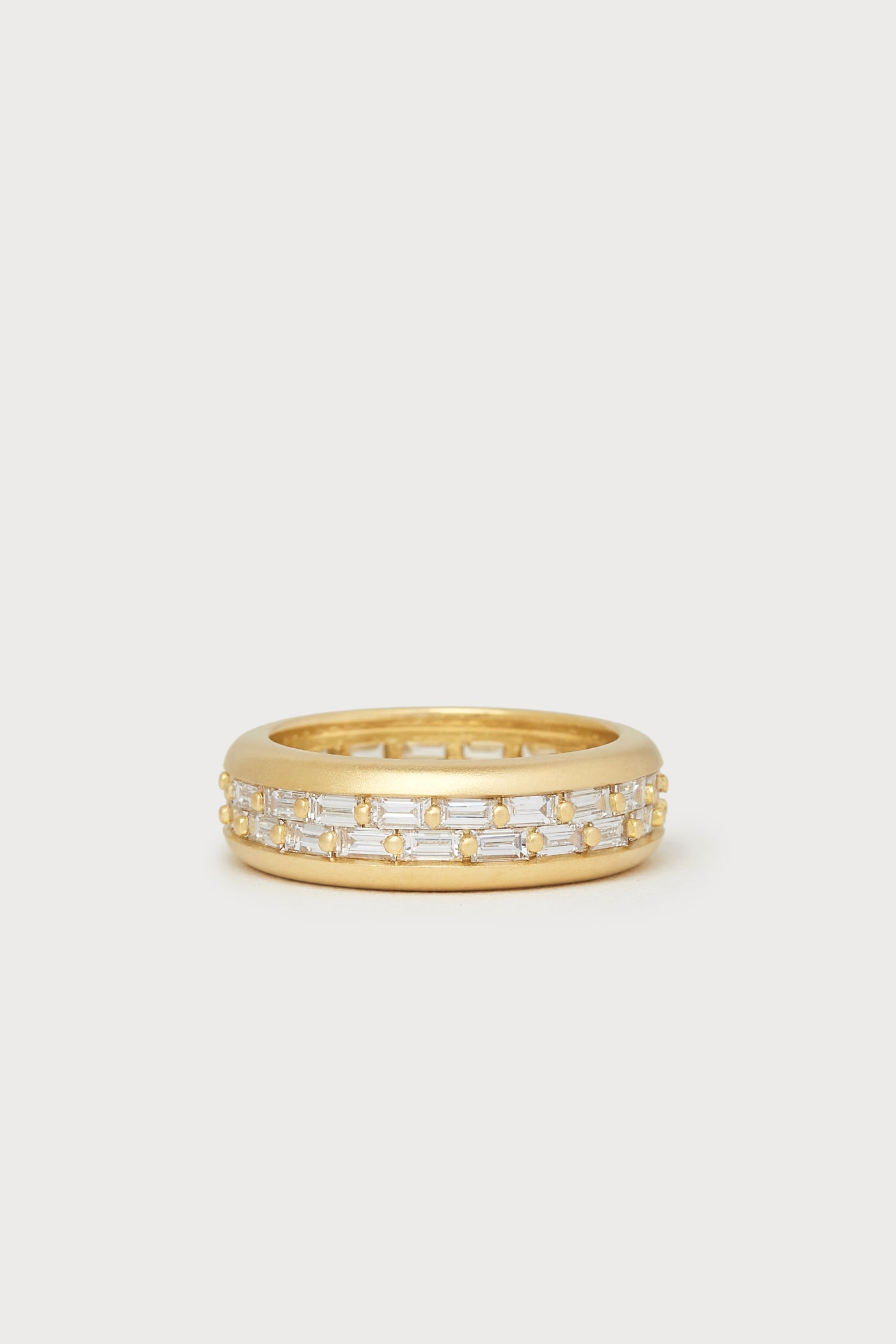 A domed eternity band set with two rows of baguette diamonds in an alternating checkerboard pattern.