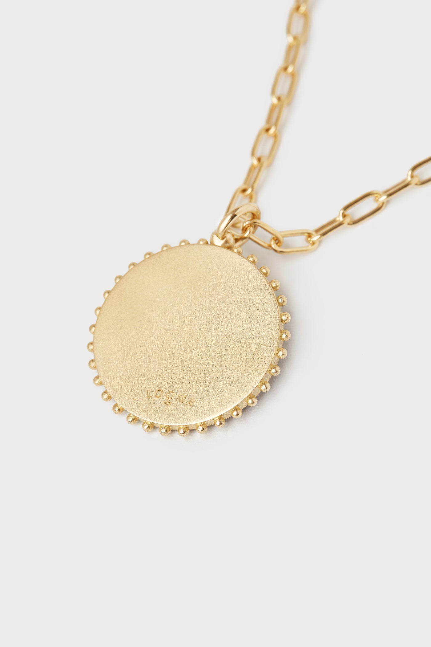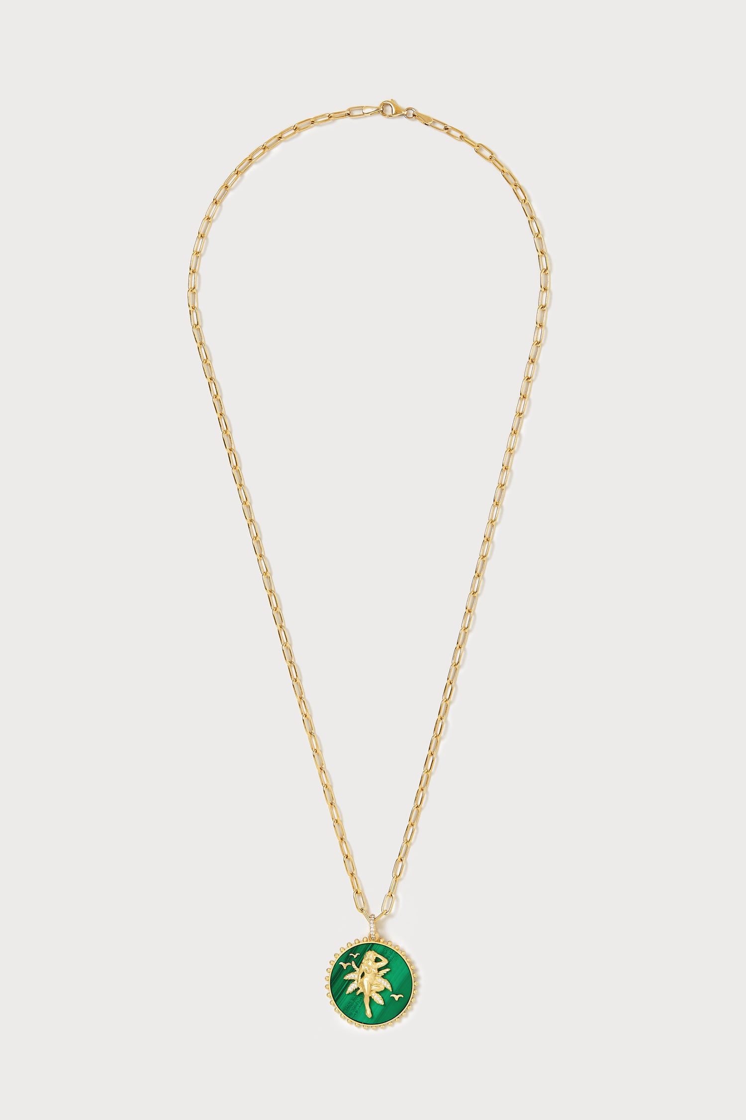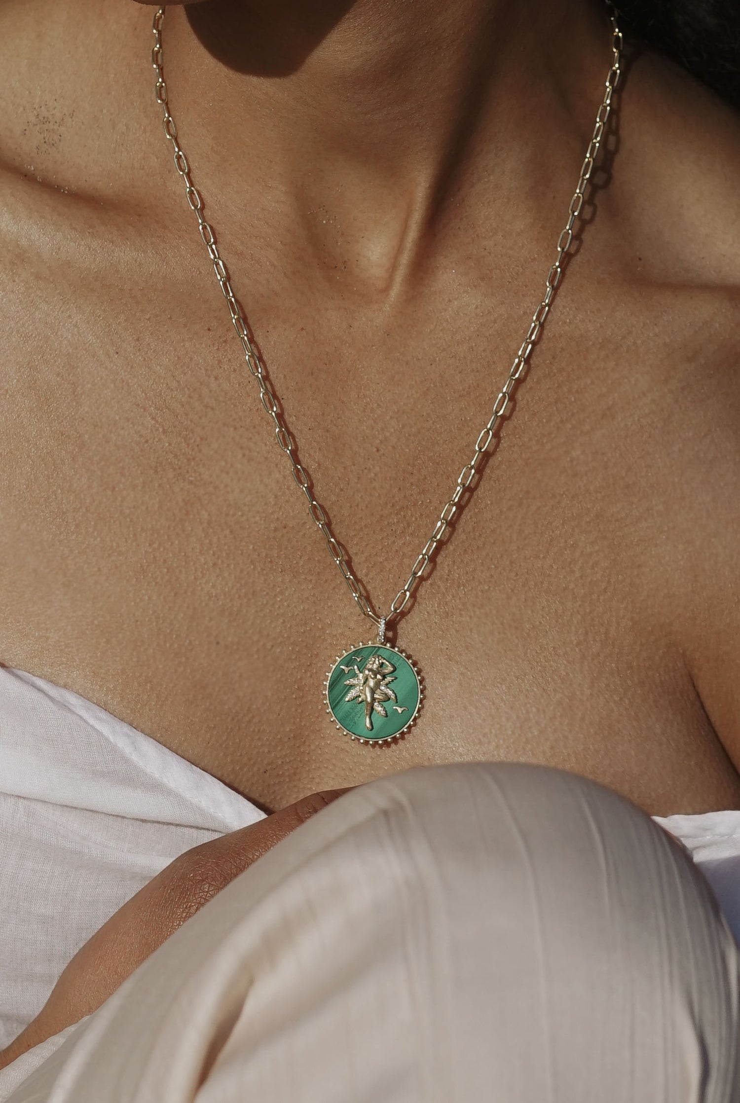Scenic view ahead. A diamond sprinkled, hand carved vignette of Lady Palma with her flora and fauna. The gold beaded pendant hangs from a diamond bail and a handmade chain.