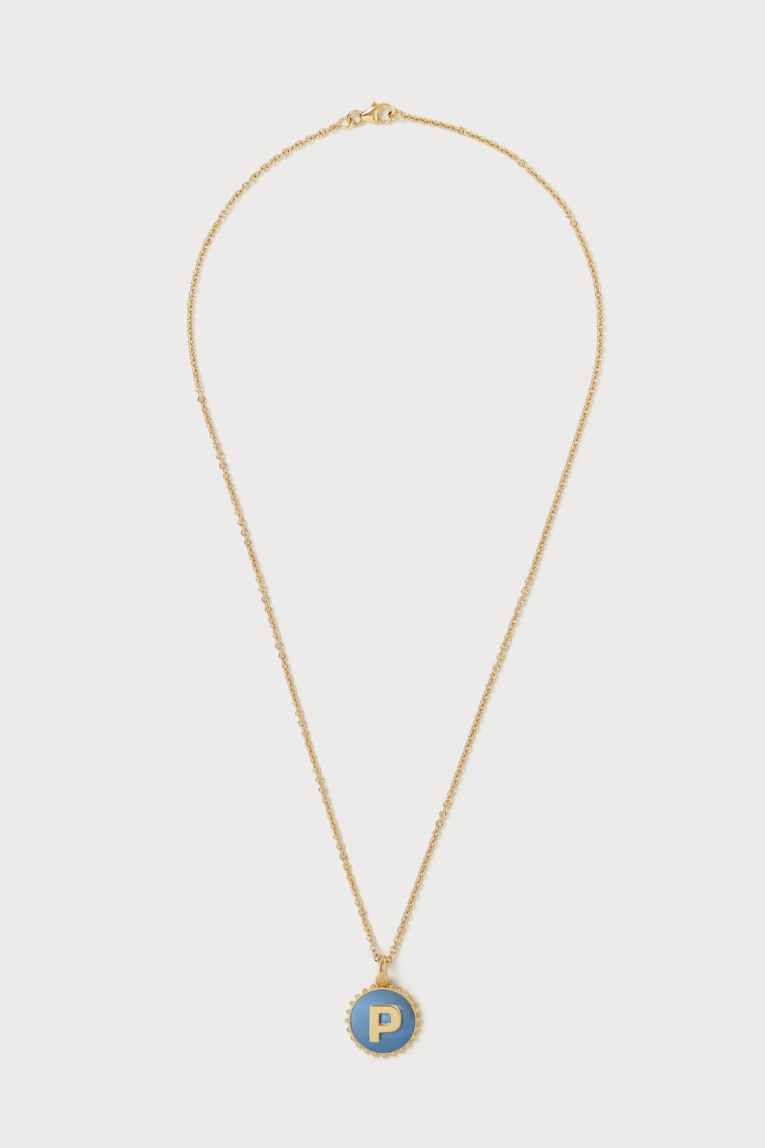An initial necklace adorned with a gold letter on a hand carved blue opal inlay.