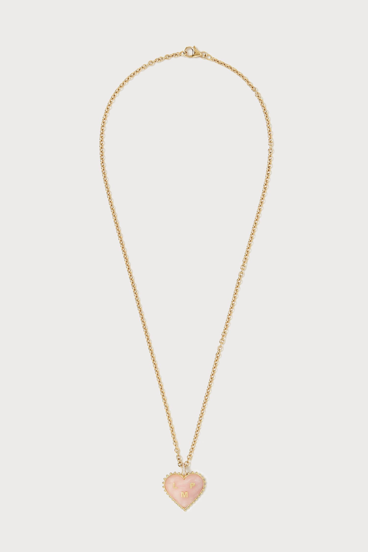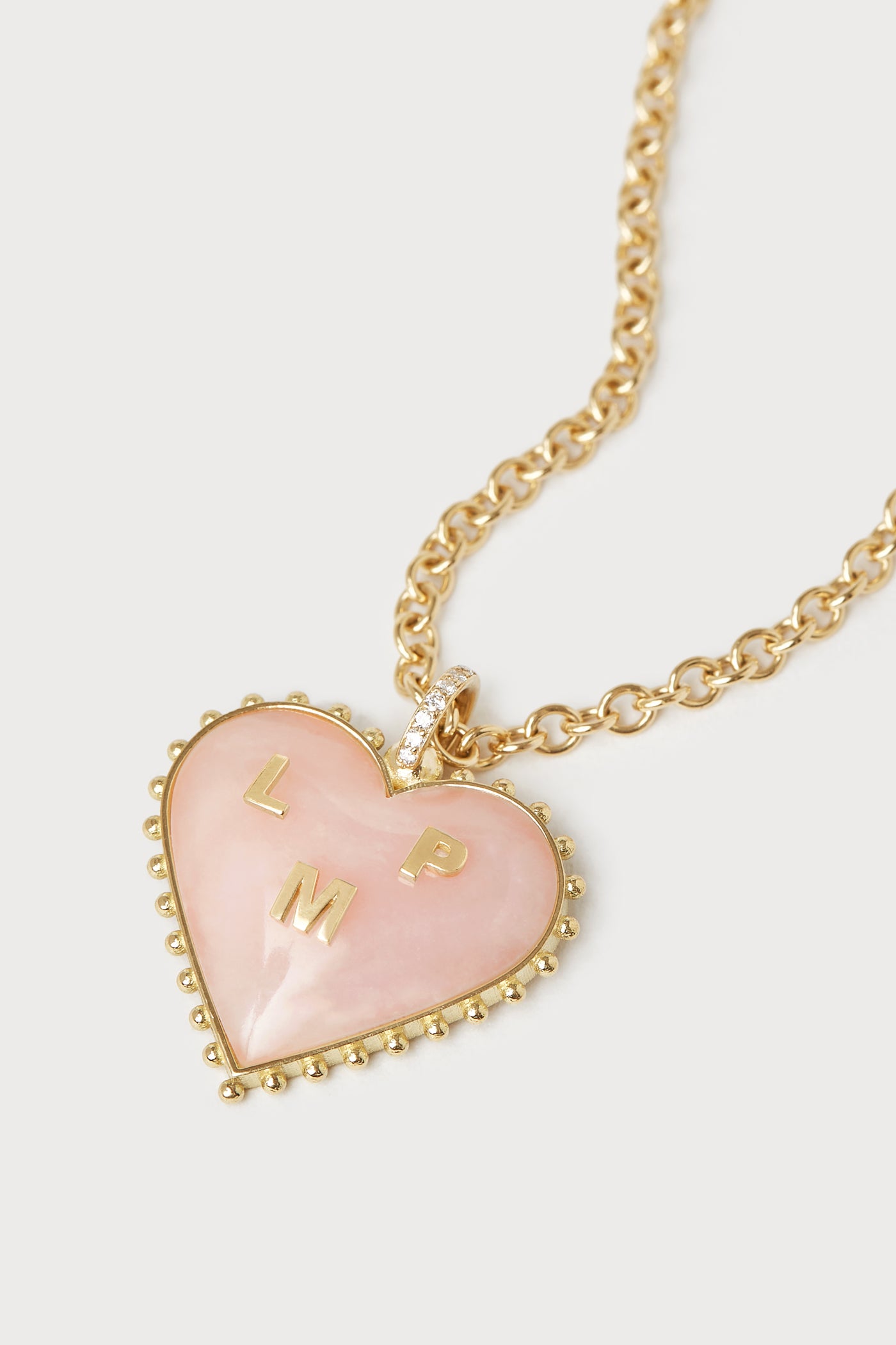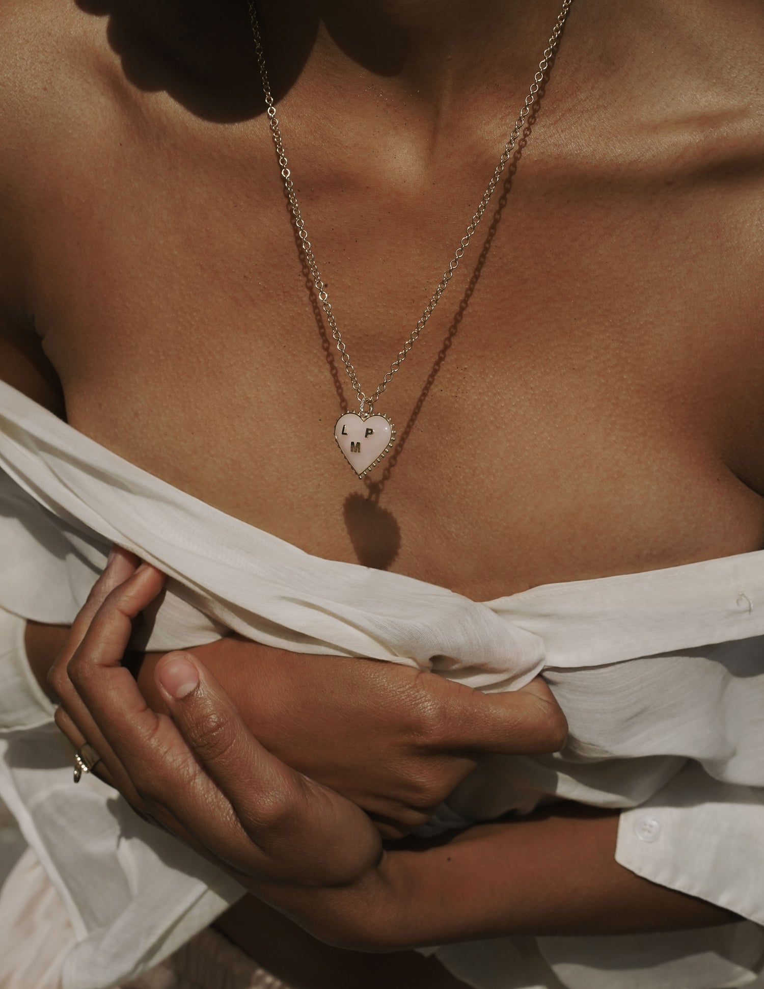 A hand carved pink opal heart adorned with a diamond bail and initials of your choice.
