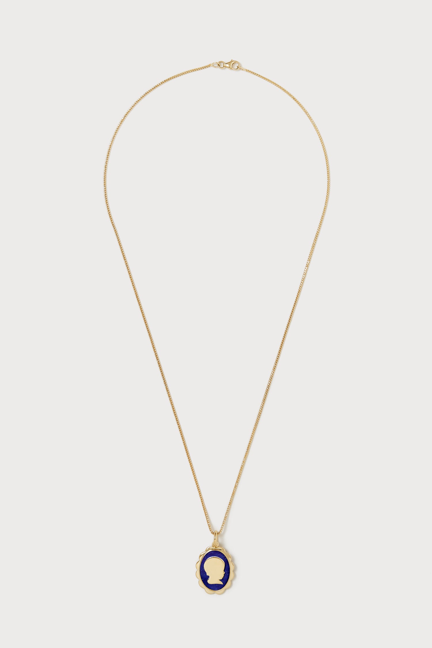 A wearable memento to keep loved ones close. To create this necklace we use a photograph of your choice, trace the silhouette, then cast it into gold. This bespoke necklace has a scalloped border and a hand carved lapis inlay.