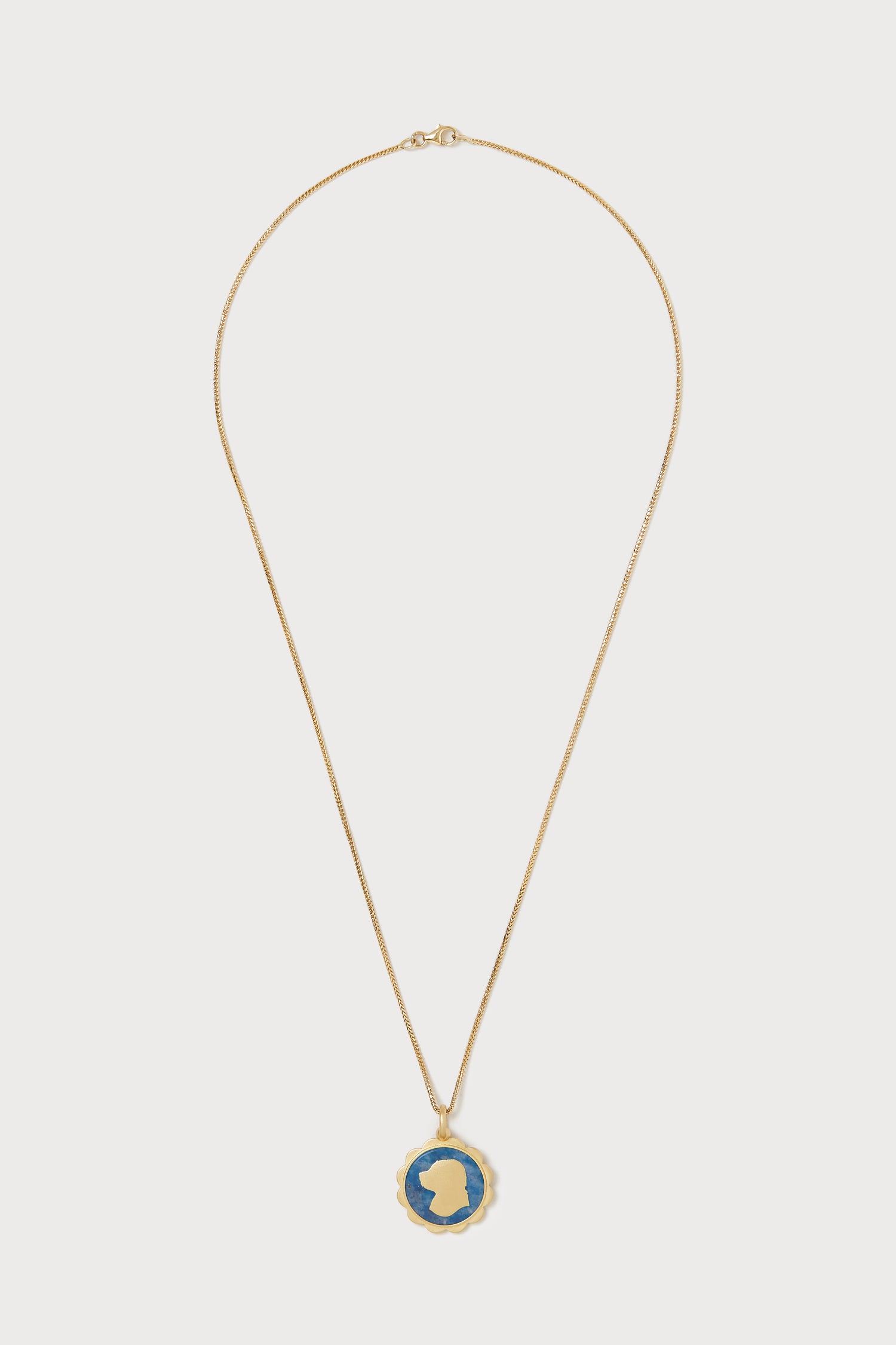 A wearable memento to keep loved ones close. To create this necklace we use a photograph of your choice, trace the silhouette, then cast it into gold. This bespoke necklace has a scalloped border and a hand carved denim lapis inlay.