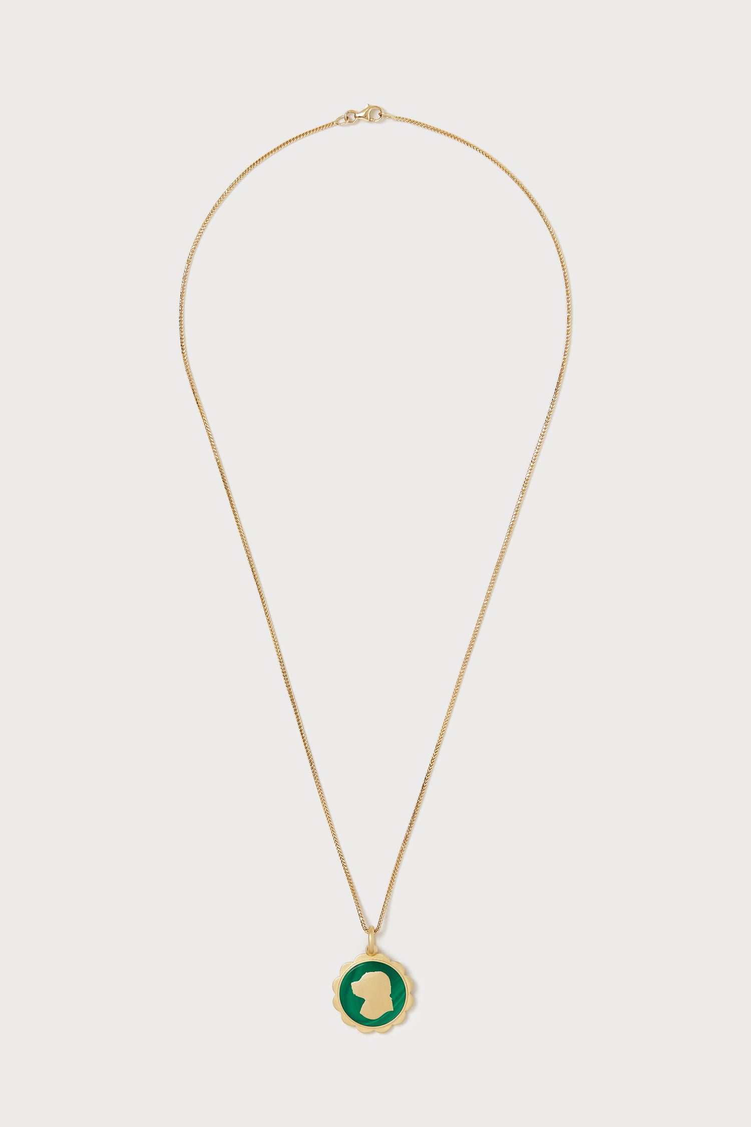 A wearable memento to keep loved ones close. To create this necklace we use a photograph of your choice, trace the silhouette, then cast it into gold. This bespoke necklace has a scalloped border and a hand carved malachite inlay.